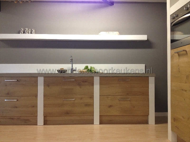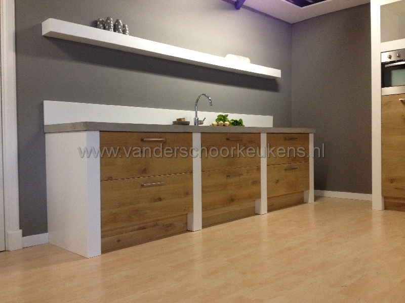 - werkblad: Kleur Beton randen60mm 313lang 65cmdiep; - smetplint: witgelakt hout 304cmlang; - spoelbak: RVS onderbouw 50x40cm; - binnenkasten: krasvast hpl-multiplex; - zijwanden/stollen: plaatmateriaal witgelakt; - fronten: eiken horinzontaal blankgelakt; - plinthoogte: 17cm; - werkhoogte: 93cm; - laden: volmetaal + softclose ladegeleiders; - scharnieren: volmetaal + softclose; - grepen: robuuste RVS greep; - onderkasten: stol10cm, ladekast90cm, stol10cm, ladekast90cm, stol10cm, ladekast90cm, stol10cm, totaal310cm; - hogekasten: stol10cm, apparatenkast60cm, apparatenkast60cm, stol10cm, 141cmbreedt, 231cmhoog, 60cmdiep; - bovenkasten: wandschap witgelakt hout 313cm lang 10cm hoog; - keukenlengte: spoeldeel 313cm + wand 141cm; - apparatuur: nnb, prijs is exclusief apparatuur; - keuken is opgebouwd uit eenvoudig te monteren modulen; Totaal bovenstaande inclusief montage 13.600,- euro incl.btw. Met vriendelijke groet en tot ziens... Van der Schoor Keukens Autoweg 22 3911 TK Rhenen